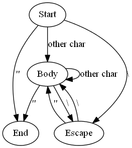 Start (")-->End Start (c)--> Body (")-->End Start (\)--> Escape (") -->Body Escape (\) -->Body Escape <--(\) Body Body (c)--> Body