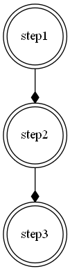 digraph G { node[shape=doublecircle]; edge[arrowhead=diamond]; step1 -> step2 -> step3; }